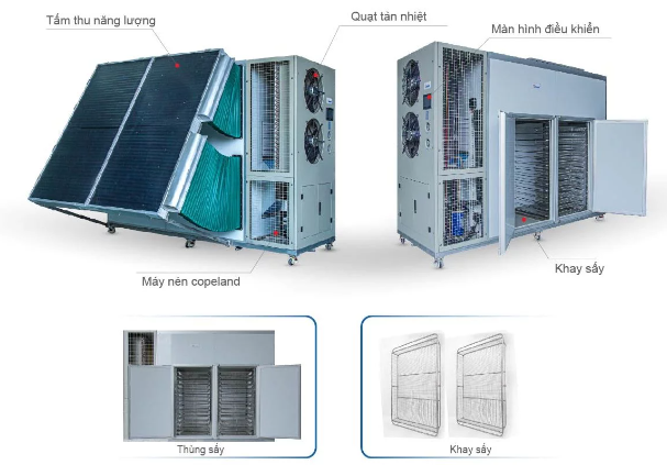 Hệ thống đã bao gồm : Thùng sấy & 64 khay sấy - tích hợp bơm nhiệt, 02 tấm thu năng lượng mặt trời hệ thống điều khiển, quạt tuần hoàn, hệ thống tách ẩm . Điện áp yêu cầu là 220V - Hệ thống đã được tích hợp đầy đủ - người sử dụng chỉ cần lắp ráp hoàn thiện - cấp nguồn và khởi động máy - Nhiệt độ sấy và thời gian sấy sẽ được cài đặt qua màn hình cảm ứng - Hệ thống tự động tắt khi độ ẩm đã đạt yêu cầu.